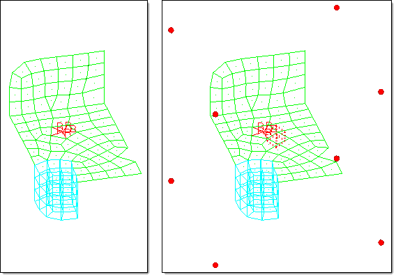 The influences between the global handles and local handles using the hierarchical method or nodes using the direct method can be calculated using either the spatial method or the geometric method. Both methods attempt to determine how a global handle affects nodes or local handles in the space surrounding it. The spatial method is the default, and is the fastest and most robust method for generating global influences based on a spatial formulation for the entire model. The geometric method can be slow for large models or large numbers of global handles, but may produce more desirable influences. The geometric method is the method that was originally used in HyperMesh and generates influences based on the geometric relationship between a given node or local handle and the surrounding global handles. The method used can be selected in the global subpanel of the Morph Options panel.