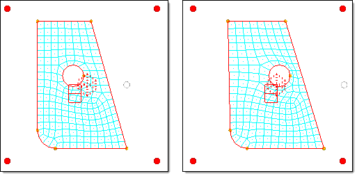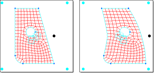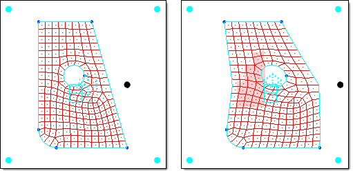 Figure 4. Global Morphing using the Direct Method. When the highlighted (white) handle is moved to the right, the mesh is affected directly. Note the resulting distortion of the edge and circle.