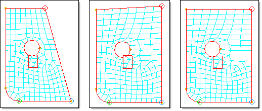 Figure 1. Control Handle Positions with Morph Constraints. The angle of the lower right corner is changed from 74 to 90 degrees using the alter dimensions (angle) operation. The middle frame shows the result with no constraints. The frame on the right shows the result with the node in the upper right corner constrained to move along a vector that lies along the top edge.