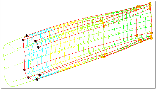 Figure 3. Morph after Mapping to Surface. All mapped nodes are automatically constrained to the surface. When the handles are translated, the nodes are moved along the surface a distance corresponding to the applied handle perturbations. If the handles were also part of the map to geom operation, they too will be moved along the surface regardless of the applied perturbation. In this example, the handles were translated linearly. HyperMorph automatically placed the handles back on the surfaces after applying the translation so that the constraint was obeyed.