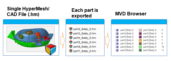 - A single CAD file will be the input. Each part inside the file will be physically separated and exported to create part structure.
