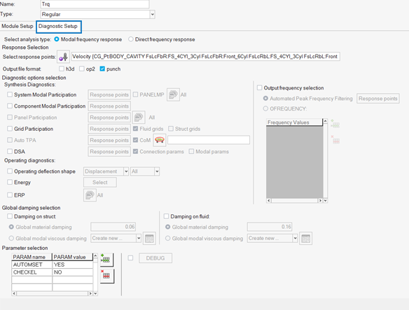 - Request diagnostic options, such as modal/panel participation, grid participation, auto TPA, ODS and element energy for concerned frequencies using PEAKOUT and OFREQ.