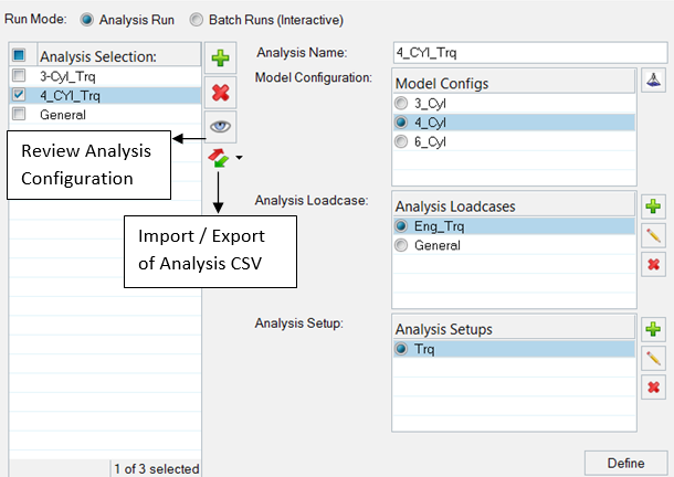 An Analysis is a collection of model configuration, analysis loadcase and analysis set-up selections that completely specifies the assembly definition for a particular loadcase simulation event.