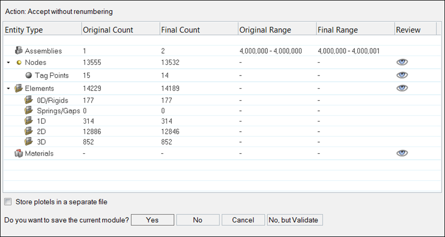 In Prepare Module mode, the HyperMesh database is first cleared to remove any potentially conflicting FE entities and then the root representation file is loaded into HyperMesh. A module ID summary is presented with all necessary information needed for you to determine if the IDs need to be renumbered and what range they should be renumbered to.