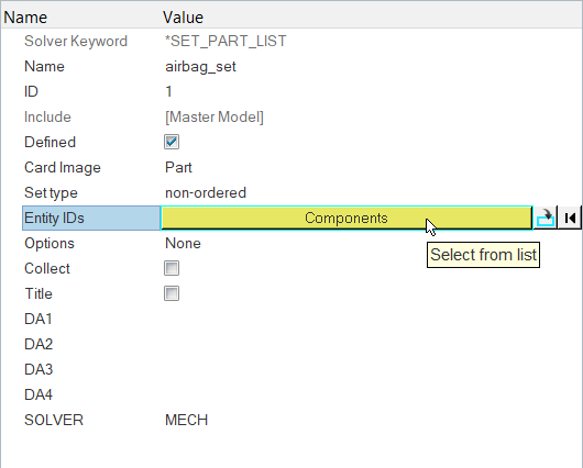 - While the Interfaces panel, add subpanel has several main and secondary entity types to choose from in order to specify the LS-DYNA main or secondary set for a *CONTACT, only the valid main and secondary types are selectable for the particular contact you are creating.