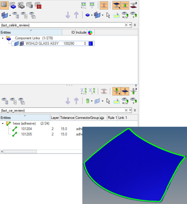Figure 3. Isolation of the Windshield Glass Components with Attached Connectors. The strings entered in the Query Builder (last_celink_review) and (last_ce_review) illustrate that the lists have been filtered. - Consider Geometry