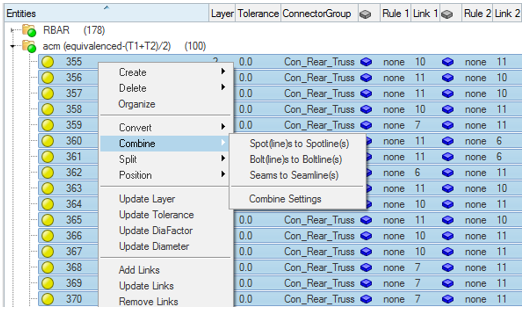 Combine aligned single point connectors into line connectors or combine several aligned seam line connectors into larger one(s) using the Combine option.