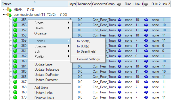 Highlight the connector(s) you want to convert, then right-click and select Convert > Style (spot, bolt, seamline) from the context menu.
