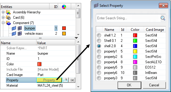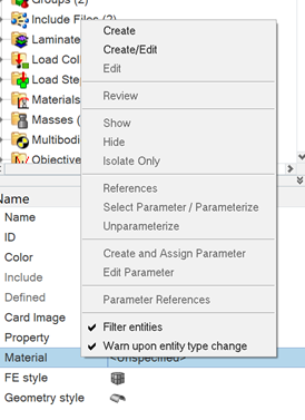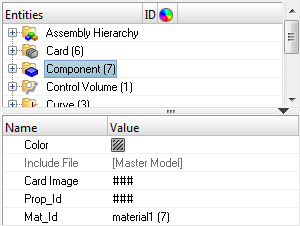 The Entity Editor can be accessed from the Model Browser, Solver Browser, and Reference Browser. In the Model Browser, the following view modes are supported: Model, Include, Component, Property and Material. When accessing the Entity Editor from the Reference Browser, you will only be able to view your entity selection's corresponding data in a non-editable form.