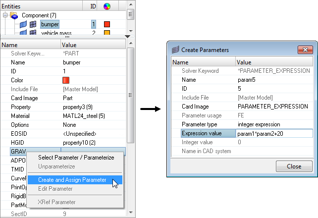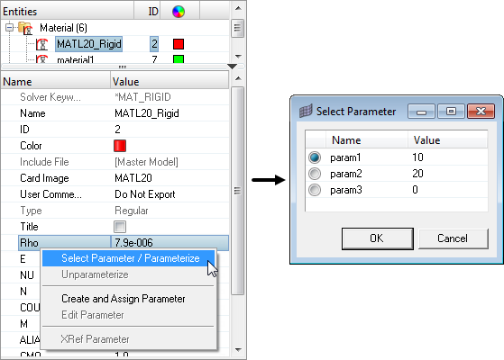 In the LS-DYNA, OptiStruct, and Radioss user profiles, certain entities can be defined with parameters in the Entity Editor.