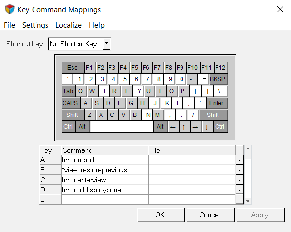 • Any HyperMesh command file commands can be mapped to a shortcut key.
