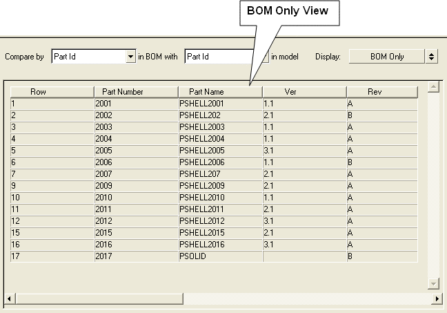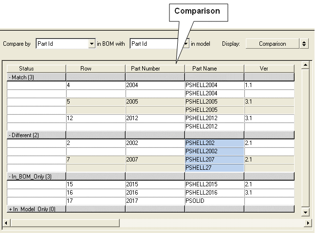 - The tool compares the attributes of a part in the BOM with the part in the model using part ID as the key.