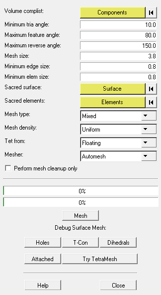 Option Description Volume complist Double-click components and use the comps collector that displays in the panel area to select comps representing the geometry of the solid to be tetra meshed. Surfaces and/or elements can be used to define the volume. Click proceed to finalize the selection. Minimum tria angle The surface trias from which the tetramesh will be extrapolated will be generated with angles that measure at least this many degrees. Use this control to limit how acute the resulting elements will be. Maximum feature angle The maximum feature angle protects nodes on corners with a feature angle greater than the value specified, helping to better maintain the geometry. This applies only to cases where you can maintain features while fixing minimum element size. For example, if two nodes of an element share different features (as in thin steps), the features may not be maintained as they do not pass minimum element criteria. Maximum reverse angle The maximum feature angle allowed between normals of adjacent elements. If the feature angle exceeds the given value, two adjacent elements are considered reversed and actions are performed to correct the situation. Mesh size Average element size of the mesh to be created. Minimum edge size No single edge of any generated element will be shorter than this. Minimum elem size Minimum allowable area for any element. Sacred surface When element nodes are moved to improved element quality, it gives special preference to trying to keep the nodes on a sacred surface. Note: This does not work if two adjacent surfaces are both marked as sacred.Mesh type The mesh type options are Trias Only and Mixed. With the Mixed mesh type, both trias and quads may be created. Mesh density Choose between chordal deviation and uniform. - Chordal deviation