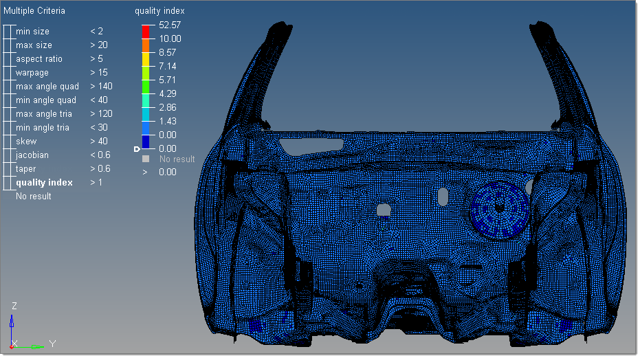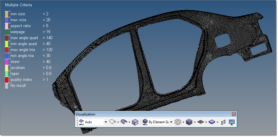 The Element Quality view allows you to investigate each specific element criteria, view a breakdown of all failed and worst elements, resolve all criteria violations at one time, and evaluate the over all quality of a mesh.