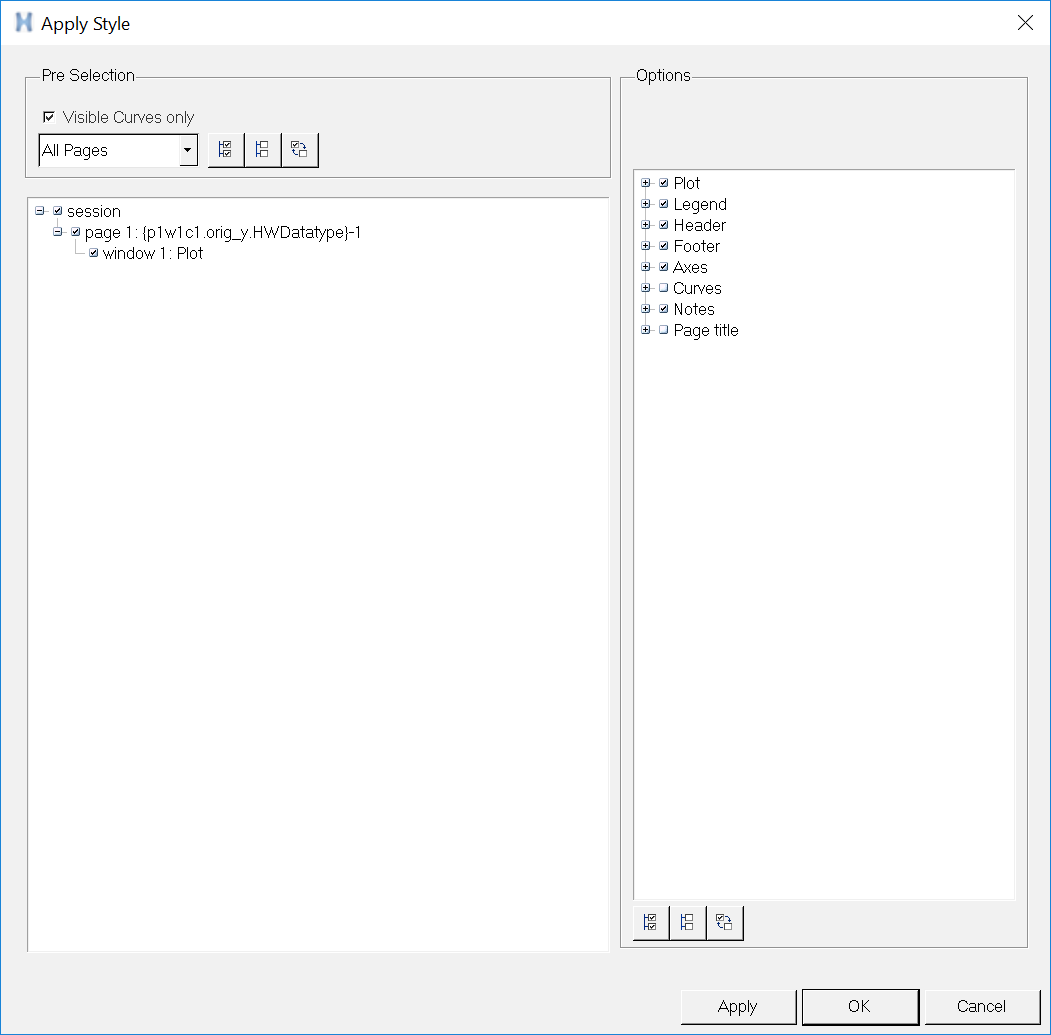 - Applies the attributes of the current plot to the previously selected curve.