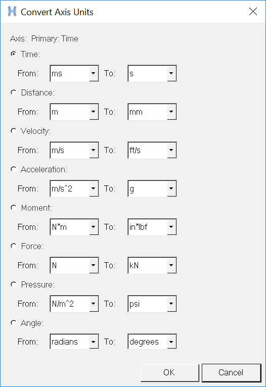 When you select Convert Units from the context sensitive menu, the application automatically selects the current axis unit of measure on the Convert Axis Unit dialog. For instance, if the horizontal axis unit of measure is meters, Distance will be selected when the Convert Axis Unit dialog is displayed. If the application cannot detect the current axis unit of measure, it automatically defaults to Time.