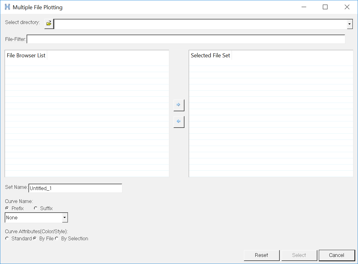 Intersecting data refers to files that contain the same type, request and component information. After making your selections and closing the dialog, you are returned to the Build Plots panel where you can select the type, request and component options for the X and Y data. Click Apply on the Build Plots panel to plot the data for the selected files. From the Multiple File Plotting dialog, you can define the curve name, curve color and line style, as well as generate file sets for the current session.