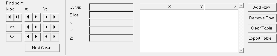 Use the scroll bars to view the entire list. When you select a row from the point list, the row is highlighted, the point data is displayed in the fields to the left of the table, and cross-hairs are displayed at the row's XYZ values.