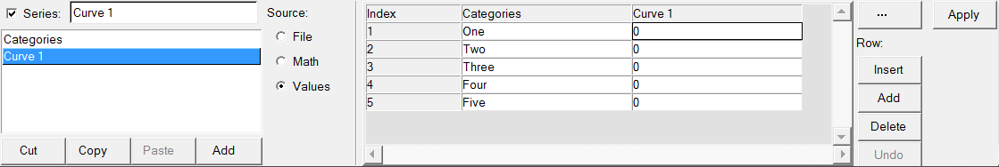 - Data point values can be entered directly into the Curve column in the Values table. Enter numbers in the Curve columns and click Apply. After adding a curve to the Curve list, a Curve column is displayed next to the Categories column. By default, a new curve is named Curve 1, Curve 2, and so on. If you change the name of the bar chart curve in the Curve list, the heading for the Curve column in the Values table also changes.