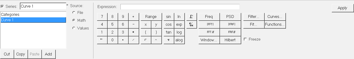 Data can be read from a data file, defined as mathematical expression, or entered as values.