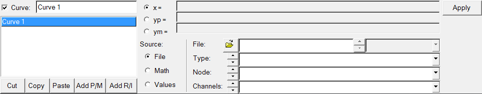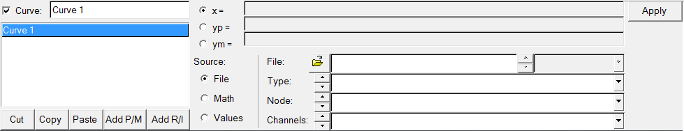 The Cut, Copy, Paste, and Add buttons are used to maintain the curve list for the active window. Curves can be copied and pasted into other windows. Curves can also be added and deleted from the list.