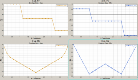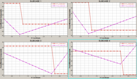 Figure 1. Sample output for X vs Fy and Mx for four subcases. The Envelop results option is unchecked. The Layout option is set to One plot per subcase.