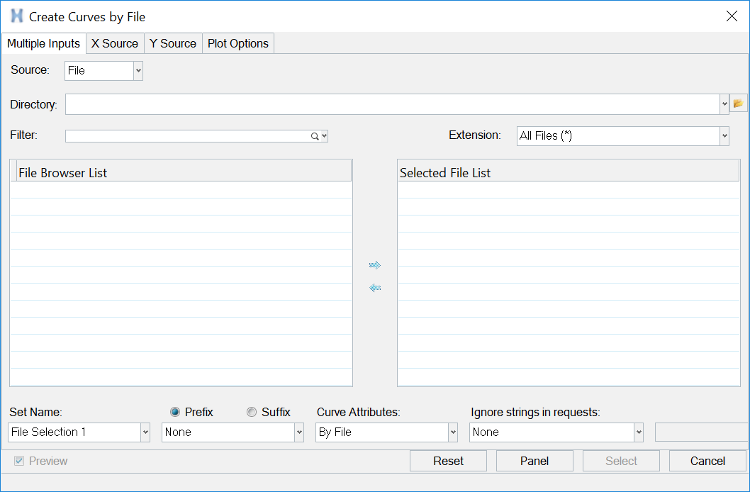 From the Create Curves by File dialog, click Multiple Inputs to select multiple files with intersecting data (for example, multiple runs of a test) and plot the data from all files simultaneously in the current HyperGraph session.