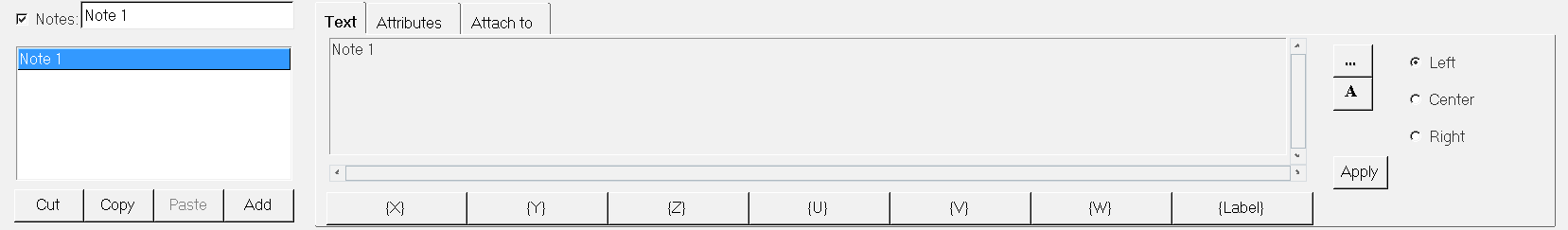 The Cut, Copy, Paste, and Add buttons are used to maintain the note list. Notes can be copied and pasted into other windows. Notes can also be added and cut from the list.