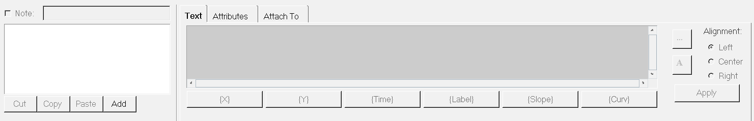 Below the note text box are six buttons that represent Templex variables that can be included in a note. For example, if a note contains the variables {X}, {Y}, and {Slope}, the X and Y values, as well as the slope of the curve at the attachment point, are displayed in the note. As the note’s attachment point changes, the Templex variables update automatically.