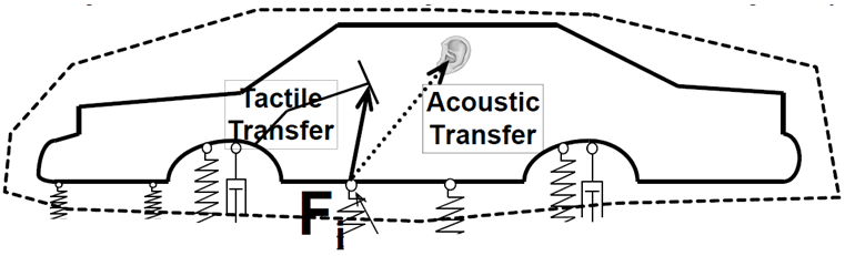 Identifies the complex contribution of the excited structure through attachment points to a response in the responding structure.