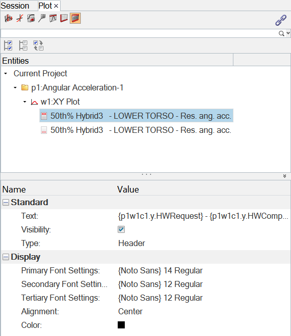 The Headers/Footers view, , displays only the header and footers in the session, grouped within their respective page and plot folders. Click on a header or footer to display its properties in the Entity Editor.