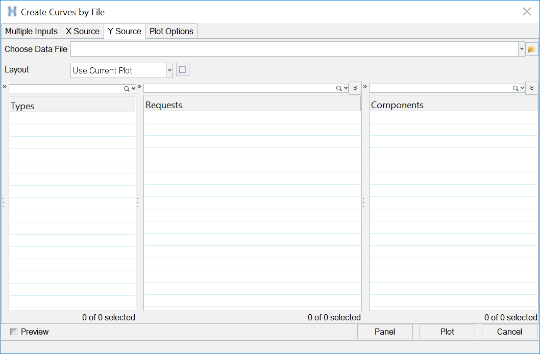 - Click the file browser button to load a data file. Y Source types are automatically populated based on the Multiple Inputs tab selections, if any. You can select multiple files through the file browser; the list will update with the selected files.