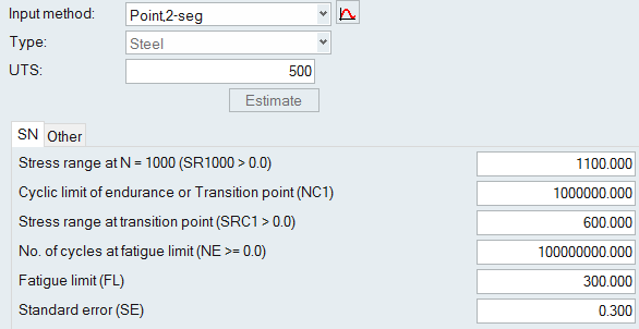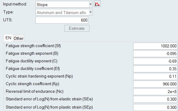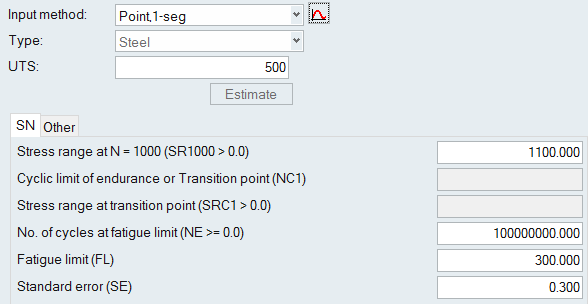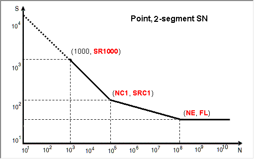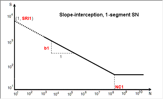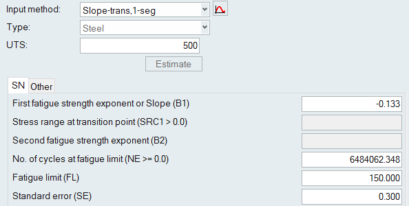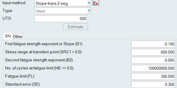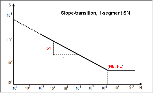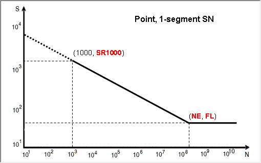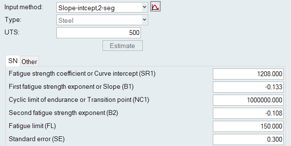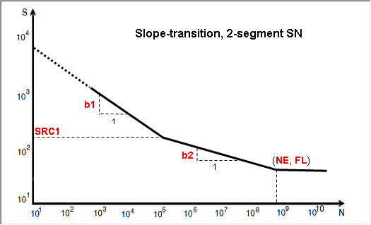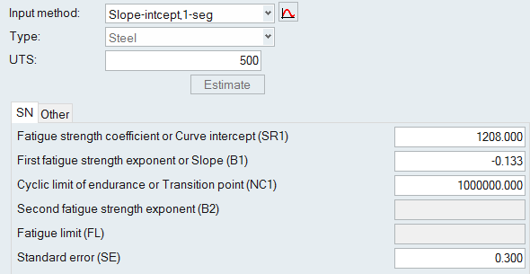 Other Methods for Fitting a Curve The following methods require certain parameters other than UTS to define the SN/EN curve. From the Assign Material dialog, click the My Material tab and select your created material. Select an input method. Click to view the model description. Define any necessary parameters. Note: The images below use the default values as a guideline. SN Properties Figure 1. Point, 1-seg Figure 2. Point, 2-seg Figure 3. Slope-intcept, 1-seg Figure 4. Slope-intcept, 2-seg Figure 5. Slope-trans, 1-seg Figure 6. Slope-trans, 2-seg EN Properties Figure 7. Slope