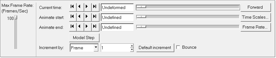 | Max Frame Rate: (Frames/sec) | The speed of the animation can be changed during playback. Move the slider bar up to increase the animation speed (increase the frame rate). Move it down to decrease the animation speed (reduce the frame rate). The model will animate as fast as possible; however it will not go beyond the value specified in the Max Frame Rate. Animation speed also depends on the size of the model and the performance level of the hardware in the workstation you are using. |