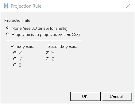 In order to have a projected coordinate system, you must pick a 3D reference coordinate system from the resolved in pull down menu. This reference coordinate system can either be a global or a user-defined system. Then, the Primary axis (of the reference coordinate system) will be projected on the element plane to obtain the local x axis. If the Primary axis is perpendicular to the element plane, the Secondary axis will be projected to obtain the local x axis. You have the option to pick the Primary axis and Secondary axis from the Projection Rule dialog.