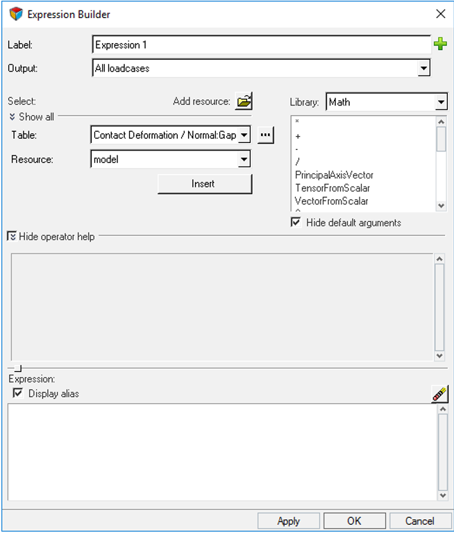 The expression text is made up of operators and table arguments, and validation occurs when Apply or OK is clicked (invalid expressions will not be processed). The expression text is parsed into the equivalent XML form and is passed on to Result Math. The user-defined data type is then added to the subcase and is made available for selection in any of the post-processing panels within HyperLife. Only when the user-defined data type is selected for reading by a HyperWorks application will it be processed by Result Math.