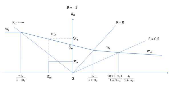 If all four slopes are specified for mean stress correction, the corresponding Mean Stress Sensitivity values are slopes for controlling all four regimes. Based on FKM-Guidelines, the Haigh diagram is divided into four regimes based on the Stress ratio () values. The Corrected value is then used to choose the S-N curve for the damage and life calculation stage.
