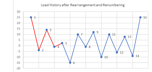 Figure 9. Load History After Rearrangement and RenumberingThe load history is rearranged such that all points including and after the highest load are moved to the beginning of the load history and are removed from the end of the load history.