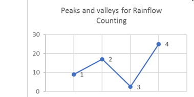 Two cycles (2→3 and 1→4) have been extracted from this load history. One of the main reasons for choosing the highest peak/valley and rearranging the load history is to guarantee that the largest cycle is always extracted (in this case, it is 1→4). If you observe the load history prior to rearrangement, and conduct the same rainflow counting process on it, then clearly, the 1→4 cycle is not extracted.