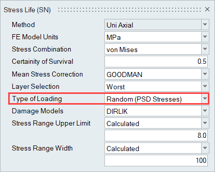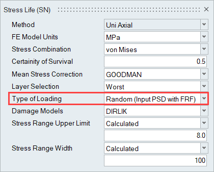 After loading an FE result file that contains a Frequency Response Analysis subcase, Random Response Fatigue is activated by setting the Type of Loading field to Random (Input PSD with FRF).