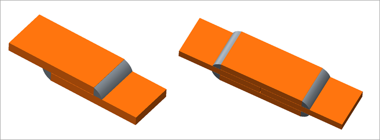 Multiple rows are recommended for welds where the weld penetration is high and the weld typically forms the basis for contact between the two plates. Such welds are more rigid compared to welds where the penetration is lower, thereby additional rows of weld shell elements are required to capture the behavior. In Figure 14, the welds have penetrated more than the welds in Figure 12.