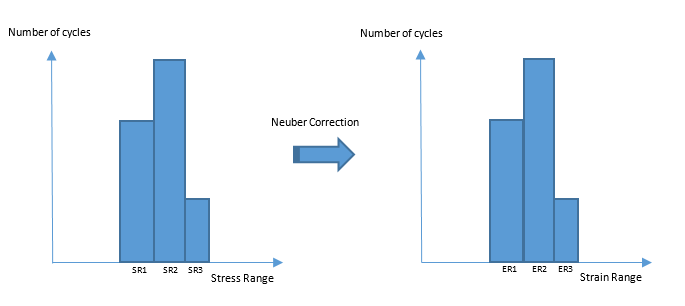 Figure 3. Neuber Correction: Histogram Bar Graph for Cycles vs Stress Range Converted to Cycles vs Strain Range