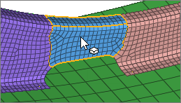 Select nodes/elements that are located on the same face as the previously selected entity. A face is defined as a region on the model surface where the angle between element normals does not exceed a certain threshold. This threshold is controlled by the Feature angle setting. This works on both shell and solid elements.