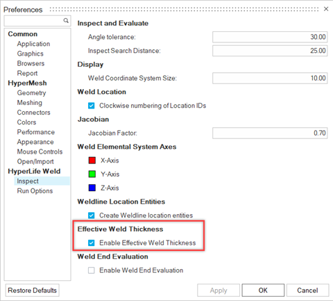 Stress (corrected) = Stress (current) * Ar / shell thickness. This applies only to the stress normal to the weld and the shear stress. By default the value of Ar is set for the minimum shell thickness and then you can modify the value accordingly.Tip: Turn on the Enable Effective Weld Thickness option in Preferences to automatically set all weld lines to Yes in the Points Context. The option is disabled by default.