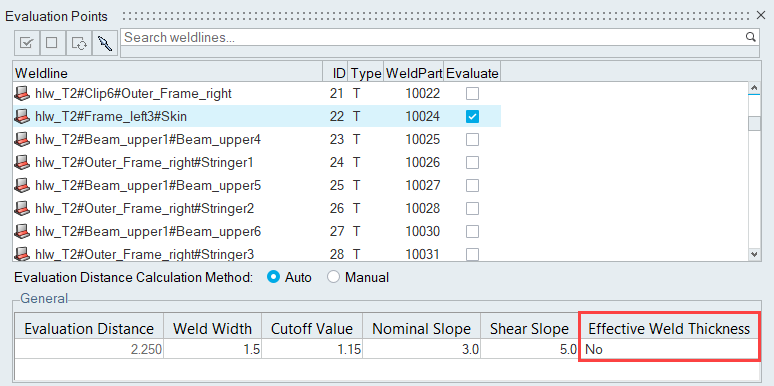 - HL-WC allows two ways to calculate the evaluation distance using an automatic method and a manual method. The automatic method calculates the evaluation distance as a function of weld width and shell thickness of the components connected by the weld line. When using the manual method you can specify the distance in model units and HL-WC will use the value as is.