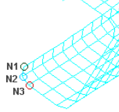 You can change the angle between three nodes/points (where three nodes/points, N1, N2, and N3 define a plane, with N2 as the center) by specifying the three nodes/points and supplying the desired angle. After you have given the new value for the angle, HyperLife Weld Certification moves N3 along the arc formed by swinging N3 around N2, until the angle is equal to the one you specified.