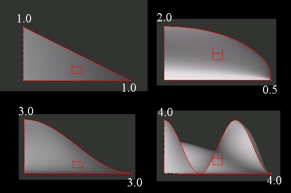 For sinusoidal biasing a bias value of 2.0 for a handle at one end of an edge domain and 0.5 for a handle at the other end will give a perfect circular or elliptical curve for the domain. For values of 3.0 and higher the influences will obey a sine-cosine curve with a frequency equal to one-half cycle plus one for each full step above 3.0 (that is 4.0 gives a frequency of one and one half cycles, 5.0 gives two and a half, and so on). Values between 2.0 and 3.0, or 3.0 and 4.0, or 4.0 and 5.0, and so on, blend the influences of a full sine-cosine curve at the higher value with that of a linear curve. In other words, a bias factor of 4.7 will give influences that are 70% of what they would be for a biasing factor of 5.0 and 30% of what they would be if they were linear.