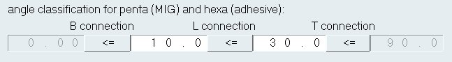 becomes a B, L, and T connection.![]() Figure 1. angle classification for penta (Mig) and hexa (adhesive) Example. Angle classifications have been defined for a hexa (adhesive). A B connection will be created when the hexa (adhesive) has an angle between 0° and 10°, a L connection will be created when the angle is between 10° and 30°, and a T connection will be created when the angle is between 30°and 90°. |