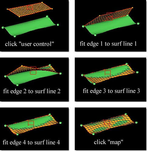 In Figure 1, the User Control panel is used to map a mesh to a surface with a single mapping operation. First the 2D domain, the surface, and the mapping direction are selected. Then the user control button is clicked. Inside the user control panel the four edge domains are mapped to the four lines around the surface one by one using the fit to line option. When all four domains have been placed, the map button is clicked and the 2D domain is mapped to the surface.