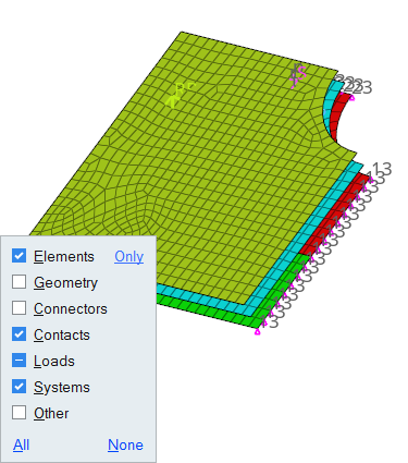 - Activate or deactivate the checkboxes in the microdialog.The microdialog lists the available entity types in your model that you can show/hide. The checkbox next to each type of entity indicates its current display state. A checked checkbox indicates that all of the entities of that type are displayed. A checkbox with a line indicates some of the entities of that type are displayed, but not all. An empty checkbox indicates that there are no entities of that type displayed.Tip: Click All/None/Only to quickly change the display state of multiple entity types.